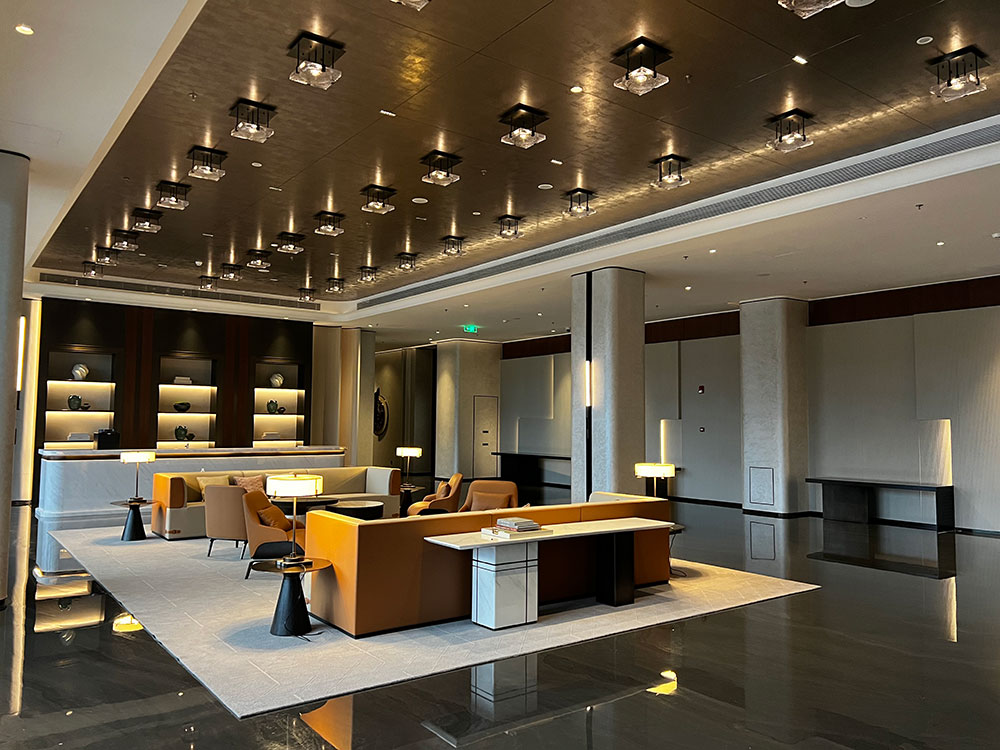 Sheraton Ninghai Hotel is unique through a series of newly upgraded design elements with brand characteristics and the use of stainless steel materials. The lobby is magnificent, with grille glass one after another, matte surface treatment, combined with lighting, like mountains, projecting a Philosophy about "Mountain".